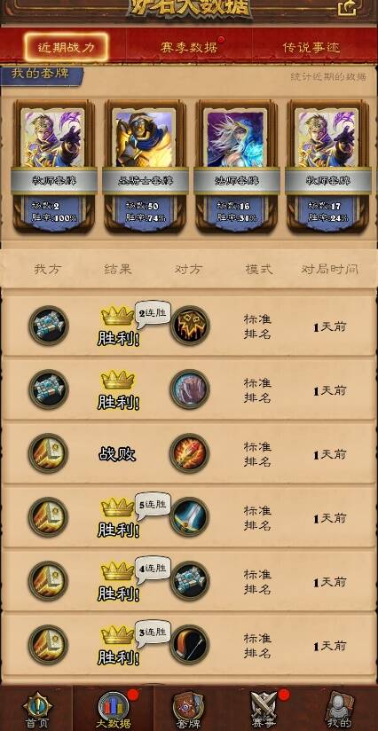 我使用这套卡组在传说末尾(49000+名)开打,打进了传说30000名以内,战绩是50场74%胜率。