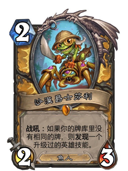 排除掉前文说过的一些战吼牌后,螃蟹骑士、终极鱼和赤鳞驯龙者基本是必选的。剩下的卡位我纠结了一会儿,其实我觉得美味飞鱼也是可以考虑的,但这要求我们手上要有龙。而它和赤鳞驯龙者都是2费,3费下它会影响到开赛集结的节奏。因此我的选择是……沙漠爵士芬利?!好吧这卡都吃灰好久了,忍不住拿出来用用。
