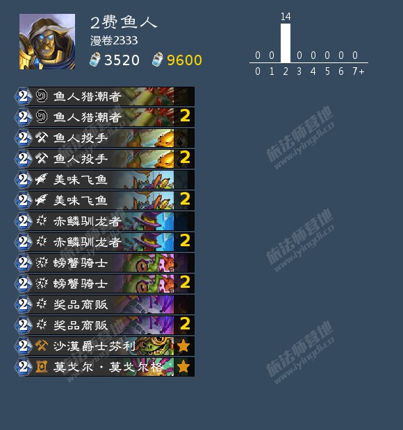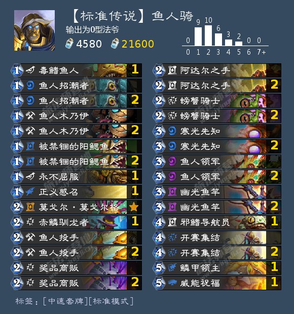 而在前一种构筑中,鱼人骑面临的最大问题是难以在前期取得场面优势,一旦起手没有禁锢鱼人就将面临下什么被解什么,且难以返场。因此,将螃蟹骑士、开赛集结这两张优质的返场牌加入构筑中,便成为了很自然而然的想法。事实上,确有玩家在鱼人骑原有的框架之上加入这四张新卡,并高胜率打上了传说。这里贴出@输出为0型法爷 的一套鱼人骑: