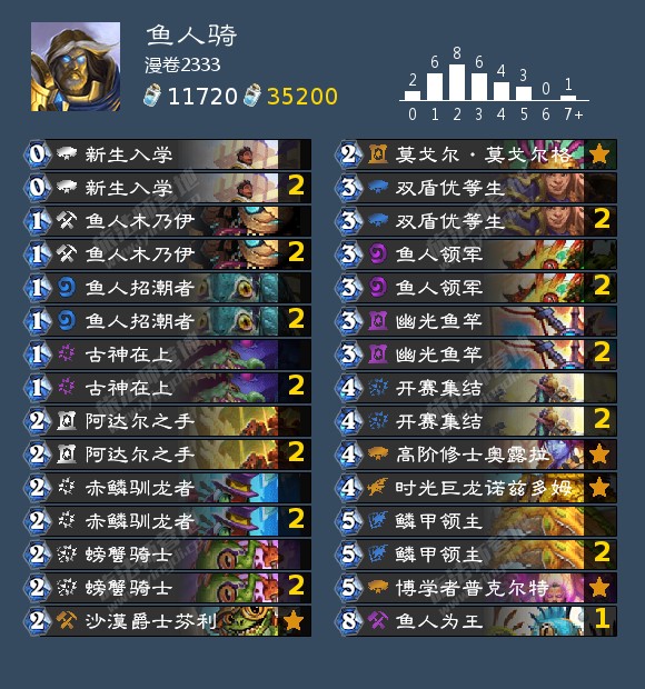 大家好,我是漫卷。这个月用奥秘法上传说以后就一直在探索好玩的牧骑卡组,而看到暗月竞速赛的新卡后,我无疑是非常激动的,4费的开赛集结无论是对牧师还是骑士而言都是一个巨大的补强。在经过思考后,我构筑出了下面这套鱼人骑;和我之前推荐过的卡组一样,这套牌在操作难度不高的同时又不失强度,表现较为稳定。