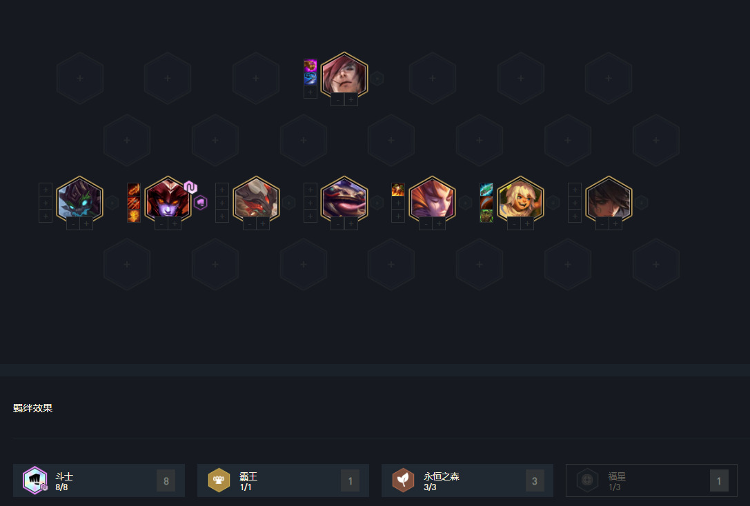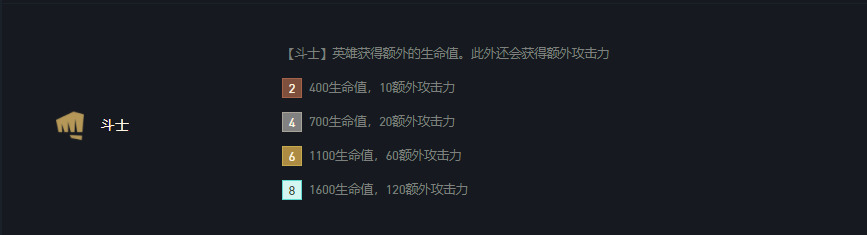 斗士羁绊在这版本重做,在增加血量的同时还会增加攻击力。8斗士增加1600的血量与120的攻击力,一共七个斗士人人增加120的攻击力,这算是斗士棋子人人斗携带4层半的杀人剑,全体普攻输出超高。在这版本龙女增加到斗士羁绊中,龙女开启技能后会从近战变远程(3格输出)还会增加血量与攻击力,普攻携带魔法伤害。3星裸装龙女在8斗阵容中,变身后攻击力可达令人恐怖的466,几口盐汽水就能喷死敌方大部分棋子。
