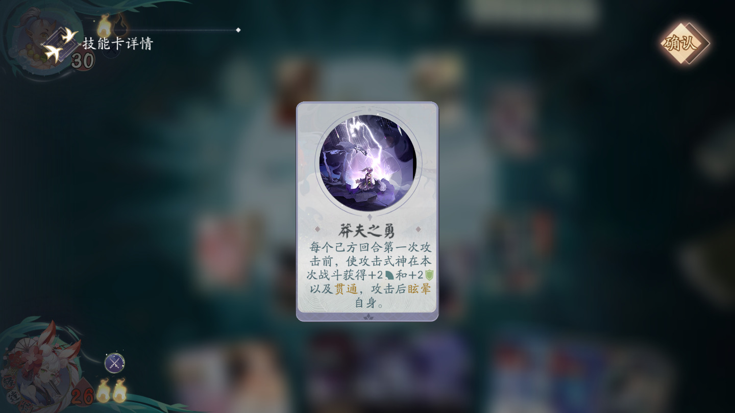 每个己方回合第一次攻击前,使攻击式神在本回合获得+2攻盒+2护甲以及贯通,攻击后眩晕自身。