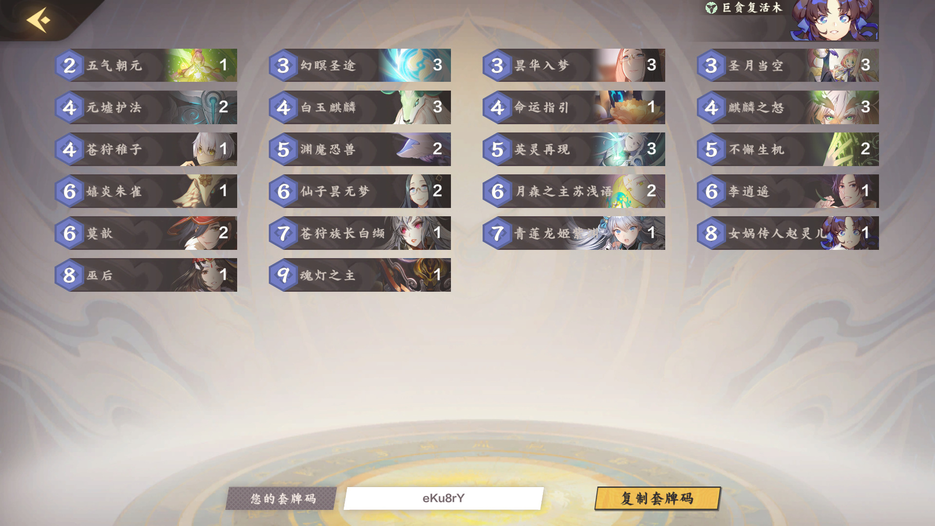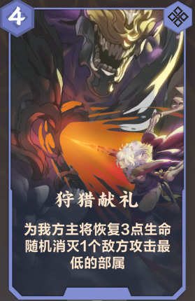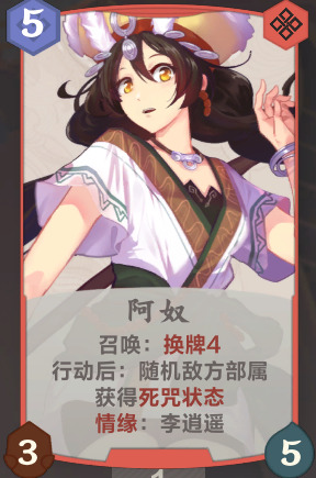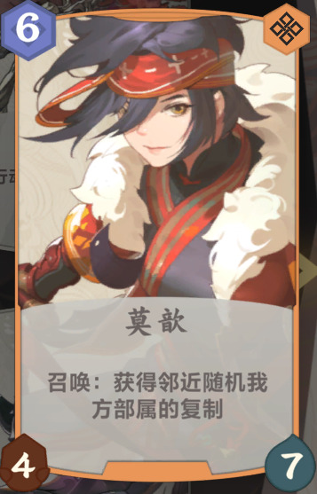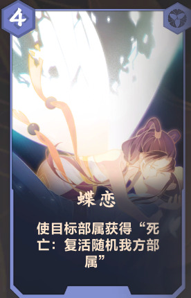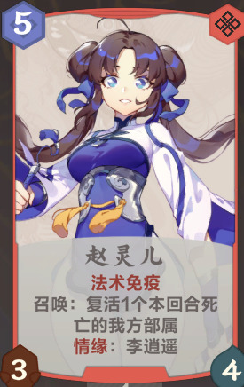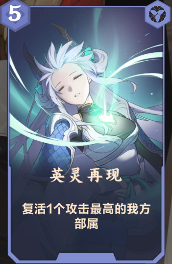 假卡三号,5费指定复活一个攻击最高的我方部署,在我们这套卡里,唯一最高攻的是7攻族长,所以可以稳定刷新大招实现连续稳定返场大哥,也可以反复横跳李逍遥或者师傅甚至苏浅语使用方法相对灵活,需要注意在释放大招的回合使用任何方式拉出(或打出)族长都是无法刷新大招的。建议满3。