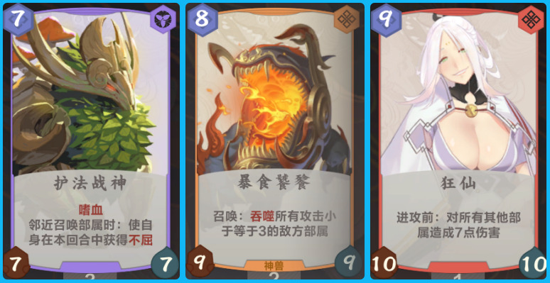 这三个放在一起讲,我先给大家讲个笑话,护法战神不是神兽,虽然长得像神兽但真不是。这张卡,个人非常喜欢,很多时候有一锤定音的效果,不带的原因是7攻影响英灵再现稳定复活族长刷新大招,狂仙和饕餮同理。还有一个不带狂仙的理由在于,复活阴带狂仙因为大招和前期先知送掉狂仙后3费回归复活可以拉出狂仙,中速灵带狂仙是因为可以跳费最重要一点可以给狂仙贴膜。而复活木并不具备这两个优势,但是如果你已经携带护法战神的情况,索性带上狂仙和饕餮也是不错的选择。