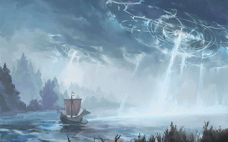 他们乘着塞瓦格村民从未见过的船到来。修长的船身,刻着光荣战役与狡诈胜利的故事,宛如雕在船首的龙兽与巨蛇般地滑行穿越波浪。它们可不像那些粗劣的渔船。既然他们再也无法进入森林,渔船便为村落提供了主要的食物来源。