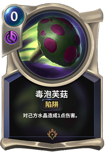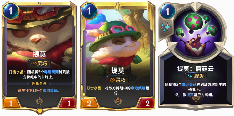 毒泡芙菇卡牌最初是由提莫和他的随从们种在牌组中的,当你抽到蘑菇卡牌时,它们会施放咒语来造成伤害。升级的提莫会使卡组中现有的毒泡芙菇数量翻倍:这既非常令人兴奋也非常危险。如果放到卡组中的蘑菇足够多,可以使整个游戏崩溃。使用新的Python脚本语言,我们可以顺利地在毒泡芙菇系统上移植并同时进行一些代码清理,从而可以将毒泡芙菇从单个卡牌切换到现有卡牌上的陷阱。