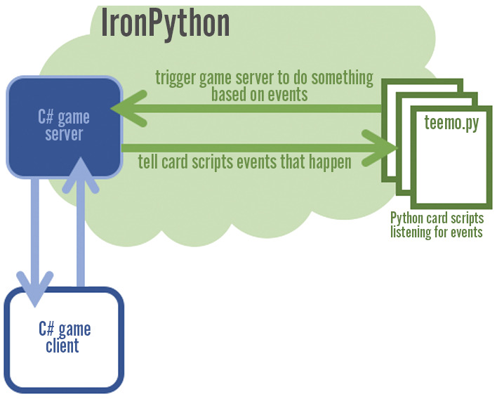 IronPython的一个巨大好处是我们可以直接从脚本访问C#对象并调用C#方法。这是将我们的C#游戏引擎连接到我们的Python卡牌脚本的胶水。如果设计师想尝试一种独特的新游戏玩法,那么他们不需要工程师先构建东西。