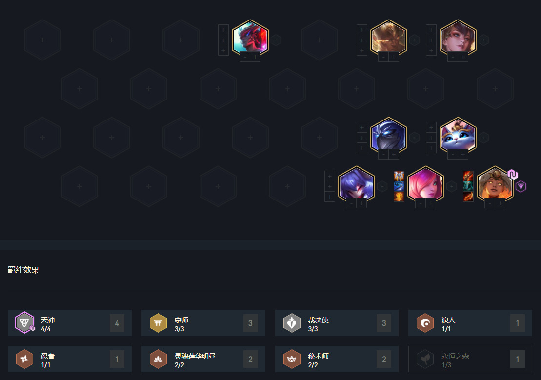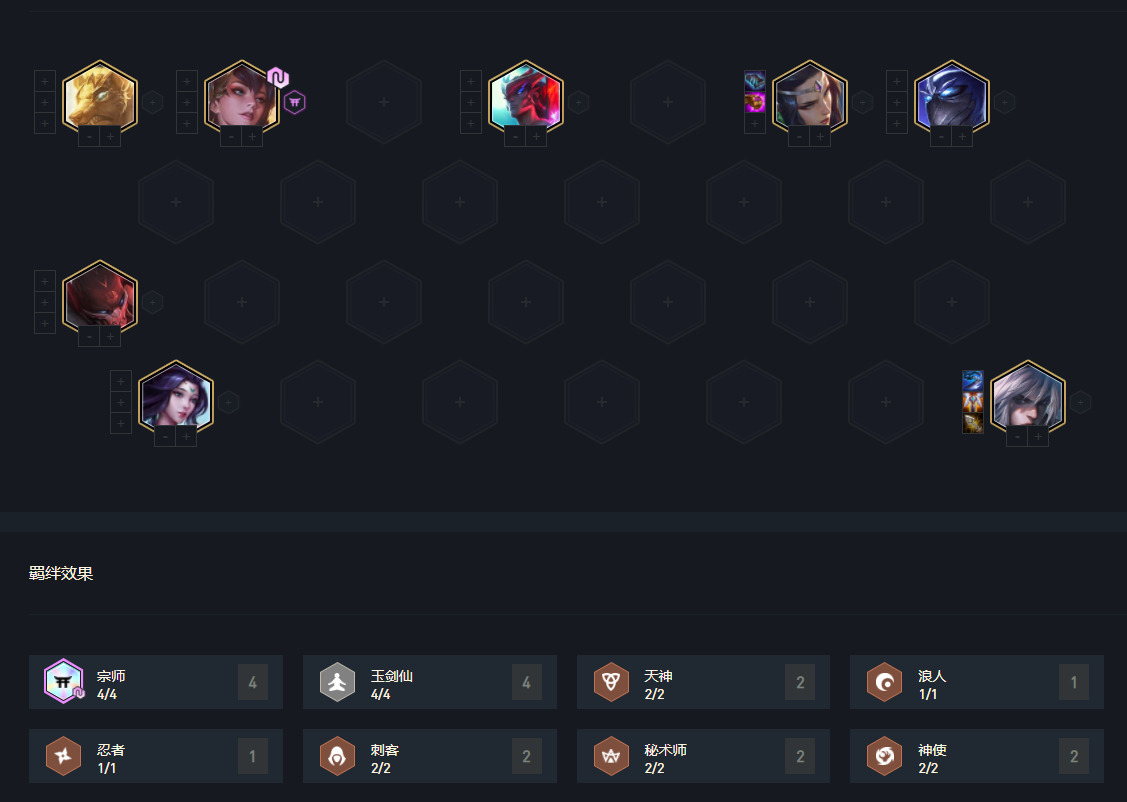 玉剑宗师在没更新前就是版本比较强势的阵容,现在永恩加强,玉剑宗师也跟着得到提升,阵容均由高费卡组成,成型后强度超高,但比较吃前中期的过度运营,但由于阵容不吃天选,这也是其优势。