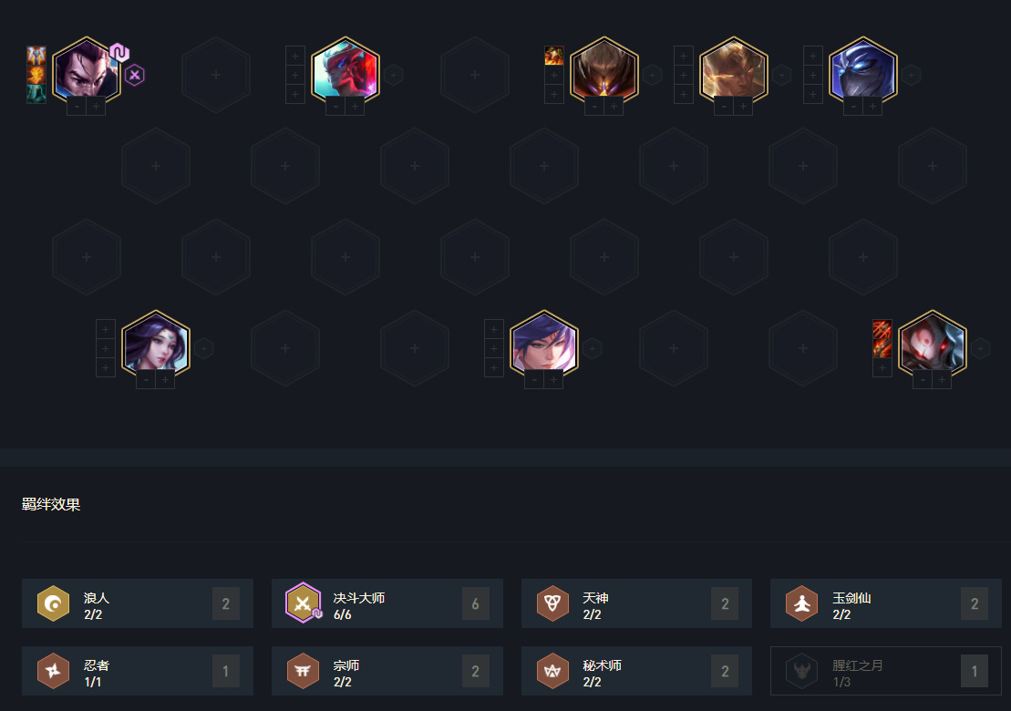 永恩的这次增强让决斗宗师稳稳的称为版本主流上分阵容。在开局白嫖亚索天选或亚索来的多的5-6只,就可以稳稳的玩决斗。决斗做为赌狗阵容,只要亚索3星来的早,就可以攒钱拉8人口,这版本赵信的下线,6决成型较难,特别是7人口很不容易搜到蛮王关羽与李青,特别建议在8人口在找,阵容成型后只要站位不算太差,就可以稳稳的吃到分。