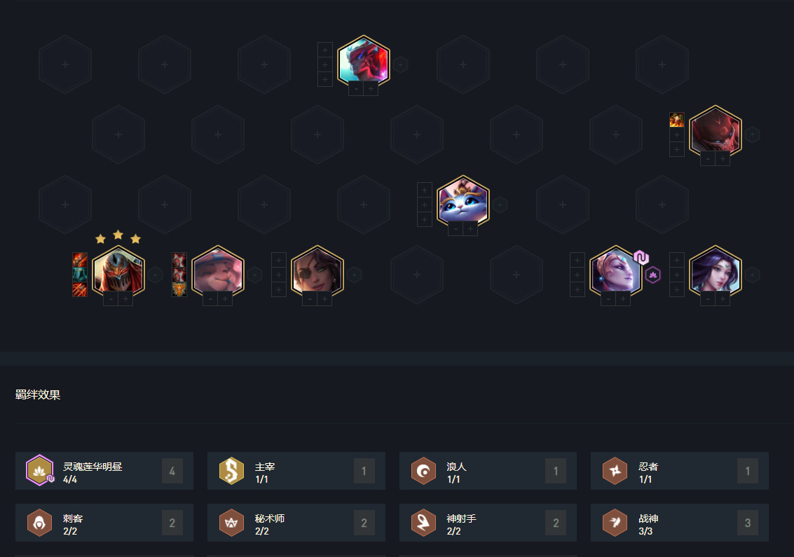 霞与洛的削弱,三国阵容再次站了起来,中期6三国的卡特为主要输出点,而后期在5费卡的加入,特别是莎弥拉或瑟提的加入后阵容强度直线攀升,莎弥拉开技能后敌方基本全员残血,蛮王轻松一刀一个进行收割。