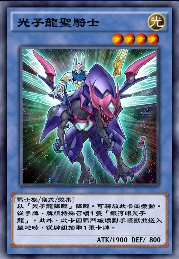 来自第十期DP20的光子新卡,光子卡组核心下级之二。特召条件简单,特召进场还可以检索银河眼光子龙。虽然特召的回合不能攻击,但是因为基本上特招进场都是用来叠R4,所以这个副作用基本等于没有。此卡做超量素材特召的超量怪兽还能获得一个战破除外对手怪兽的效果,很克制一些送墓触发遗言的怪兽。