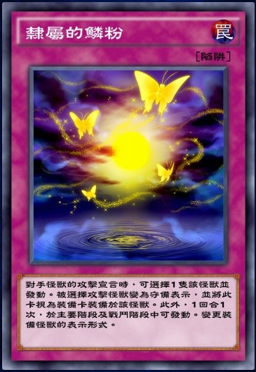 和幻蝶刺客的一些怪兽效果可以配合的一张攻宣装备坑,但是是装备给对手怪兽。然后就可以在对手回合的主要阶段和战斗阶段,想让对手攻击表示挨打,或者守备表示空过,为所欲为。