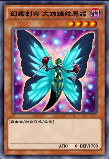 这张卡完美的诠释了游戏王的经典台词:“虽然卡文上并没有写这效果,但这张怪兽可以特殊召唤”。。。这里补上其完整效果:这张卡不能通常召唤。自己对战士族怪兽的召唤成功时,这张卡可以从手卡特殊召唤。这张卡不能作为同步素材。幻蝶刺客本家的一个特召点,基本就是用来叠R4用的了。