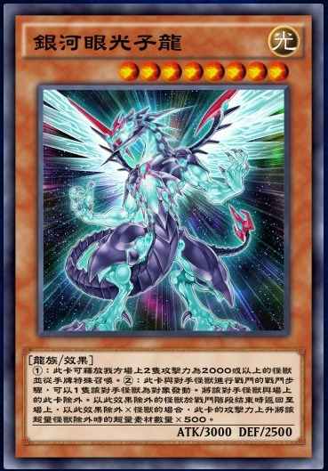 作为本次卡盒的封面怪兽,银河眼光子龙可以说非常有排面,毕竟是天城快斗这个Z4人气角色的王牌怪兽。此卡有三个字段【银河眼】、【银河】和【光子】。实卡化的银河眼光子龙和动画相比,是可以通召的。目前来说,银河眼光子龙的战阶除外效果的作用有以下几个:1、去除自己的debuff,比如被永久降低的攻击力等;2、去除对手的buff,去除对手的超量素材等;3、除去一些棘手的遗言怪或者盖牌怪等等。但是具体会在环境中表现得如何,还得看实际情况(说不定都没人带呢,实惨o(╥﹏╥)o)。最后补一句,这个②效果是在对手攻击银河眼光子龙的时候也可以发动哦,而且提升的攻击力是永久提升,除外提升完再次除外,buff会重置。