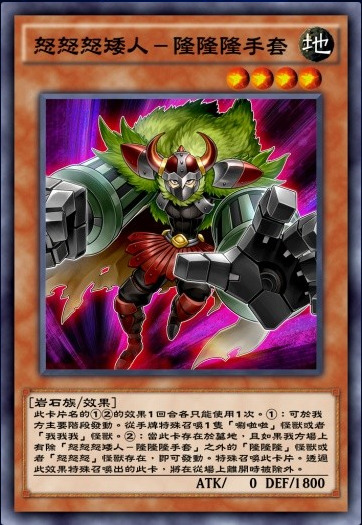双字段【怒怒怒】、【隆隆隆】,和【刷拉拉番长-我我我外套】同样来自DP23的新卡,而且是大腿卡。①效果主动拉手牌另外2个字段的怪兽,②效果从墓地跳回来,而且两个效果一回合可以各使用一次。有了这张卡,基本上口吃卡组的展开已经完全不是问题,可以做到非常流畅了,只要在加上一些泛用的坑,一套能上得了台面的beat卡组就成型了。什么,你说抽不到怎么办?DL的教主可是有一个口吃专用的无敌检索技能的,卡手是不存在的好吗。