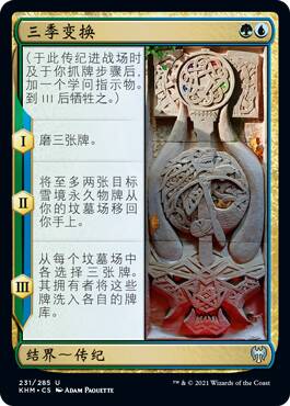 只能回雪境永久物就注定在现开中很难用出来了,而就算你套牌中雪境牌多,你真靠他磨下去几个雪境永久物回手了,好像也没有赚太多,当然你可以用他来针对对手掘坟思路的牌,不过现开中能组成那样的套牌也是极少数的情况。
