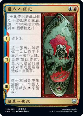 本系列个别牌把过量伤害拿出来做文章了,以往我就觉得用一个打4~5的咒语解一个2~3防生物很赔,又没处说理,有了这张牌,你可以把巨人法术师和咒语过量的伤害变成你的手牌了。但是虽然红蓝也有很多巨人法术师,战阶是否能造成过量伤害还是要看对手生物如何进攻阻挡的,你这张牌在场对手也不会傻到白让你赚牌,而红烧虽然多,但你也不能保证每次你烧你想解的目标都是过量伤害,这张牌有机会赚牌,但也是有一定限制的。