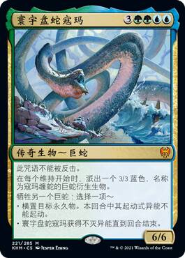 这个密西大蛇从画上就能看出强,出来之后就可以免费每个维持造3/3,能横永久物,能自保,虽然费用较大且封闭,但是再这样的一个较慢的系列,现开绿色主色想出它还是比较容易的。