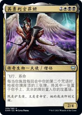 完美情况就是出他放个1/1加2血,下回合打中对手抓牌看手牌,从备牌找一张针对的牌放到牌库顶,听起来很美好,但是实际问题很多,首先我们没办法确保飞兵打中对手,没打中后两个异能等于白搭,就是3费放了个1/1加了2,其次即便是现开中我们也未必有足够好的牌针对对手,好牌谁不放进主牌呀。综上所述,这只是个理想情况还不错的金牌。