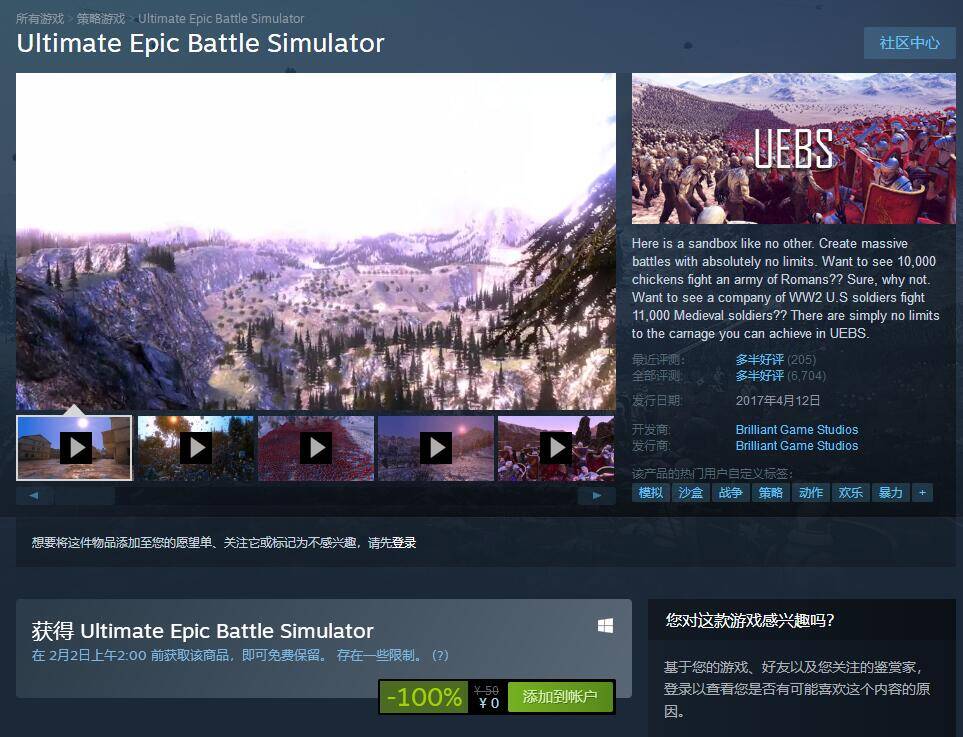 《史诗战争模拟器》免费领取活动截止至2月2日凌晨2:00前,游戏支持简体中文,原价50元,玩家多半好评,现可喜加一入库。