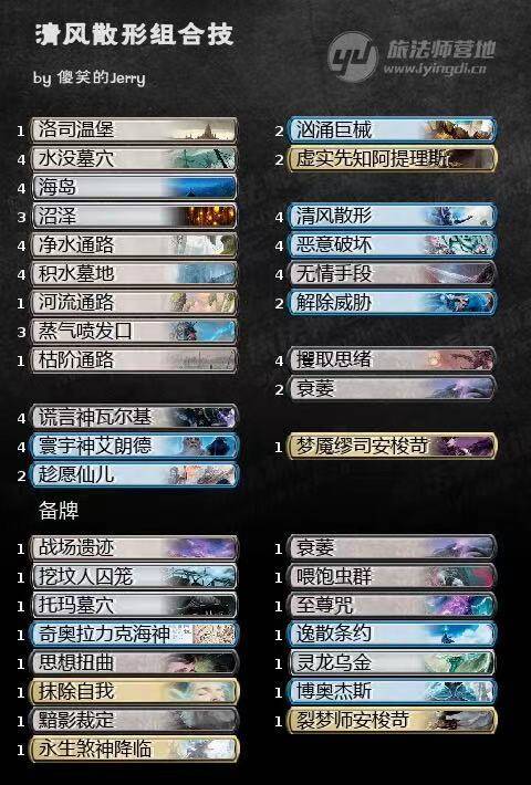 Plan B:蓝黑控,加入杀、康、思绪、扫场、几张wincon,当做传统蓝黑控打。单卡的选择包括比较常规的攫取思绪、恶意破坏、无情手段、梦魇缪司安梭苛,还可以加入其他一些能跟清风散形配合的单卡,比如虚实先知阿提理斯这样有进场异能的牌,或者加入趁愿仙儿(清风散形放逐仙儿也可以免费施放历险那一半)找备牌,来弥补当前蓝黑控缺少强力wincon的不足。