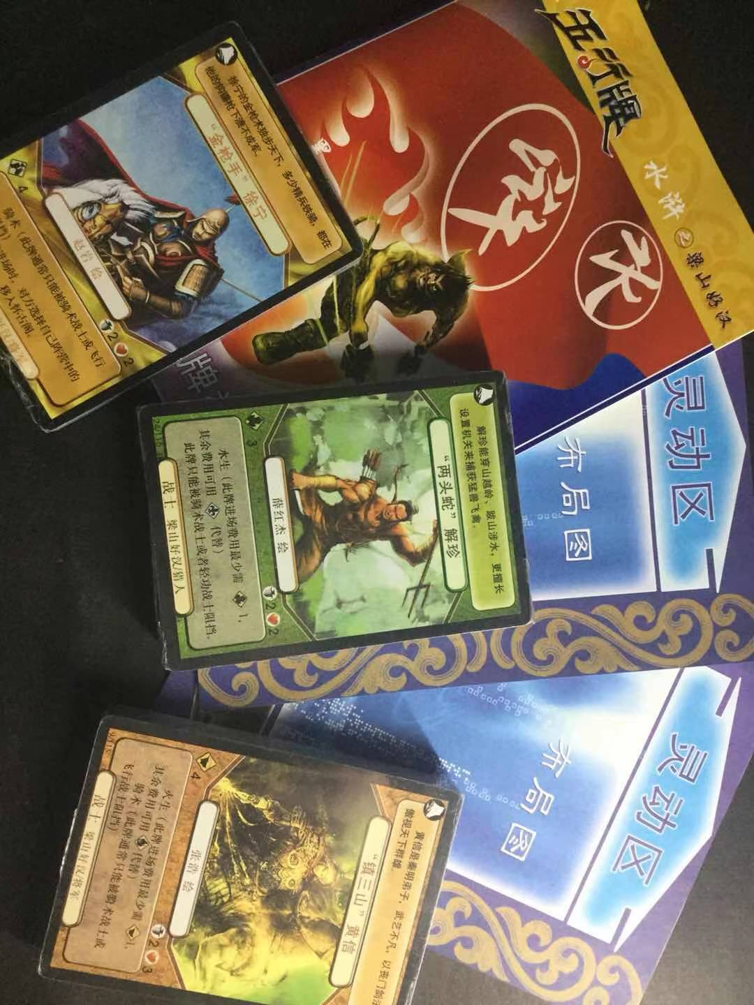 《中华五行牌》的第一个系列主题是《水浒传》,所以当时游戏的全称是《中华五行牌:水浒之梁山好汉》。照片里就是起始套牌,内容是由75张卡牌组成的两套对战套牌。《中华五行牌》顾名思义就是借用了 金木水火土 的概念,作为卡牌的属性和费用需求。游戏可以看到《万智牌》的一些影子,但重要的是《中华五行牌》创造了独立的“费用卡牌库”概念,而不是再将费用卡牌和其他卡牌混在一起,靠随机抓取。也就是说尽可能在设计上去避免了《万智牌》常见的“卡地”现象。
