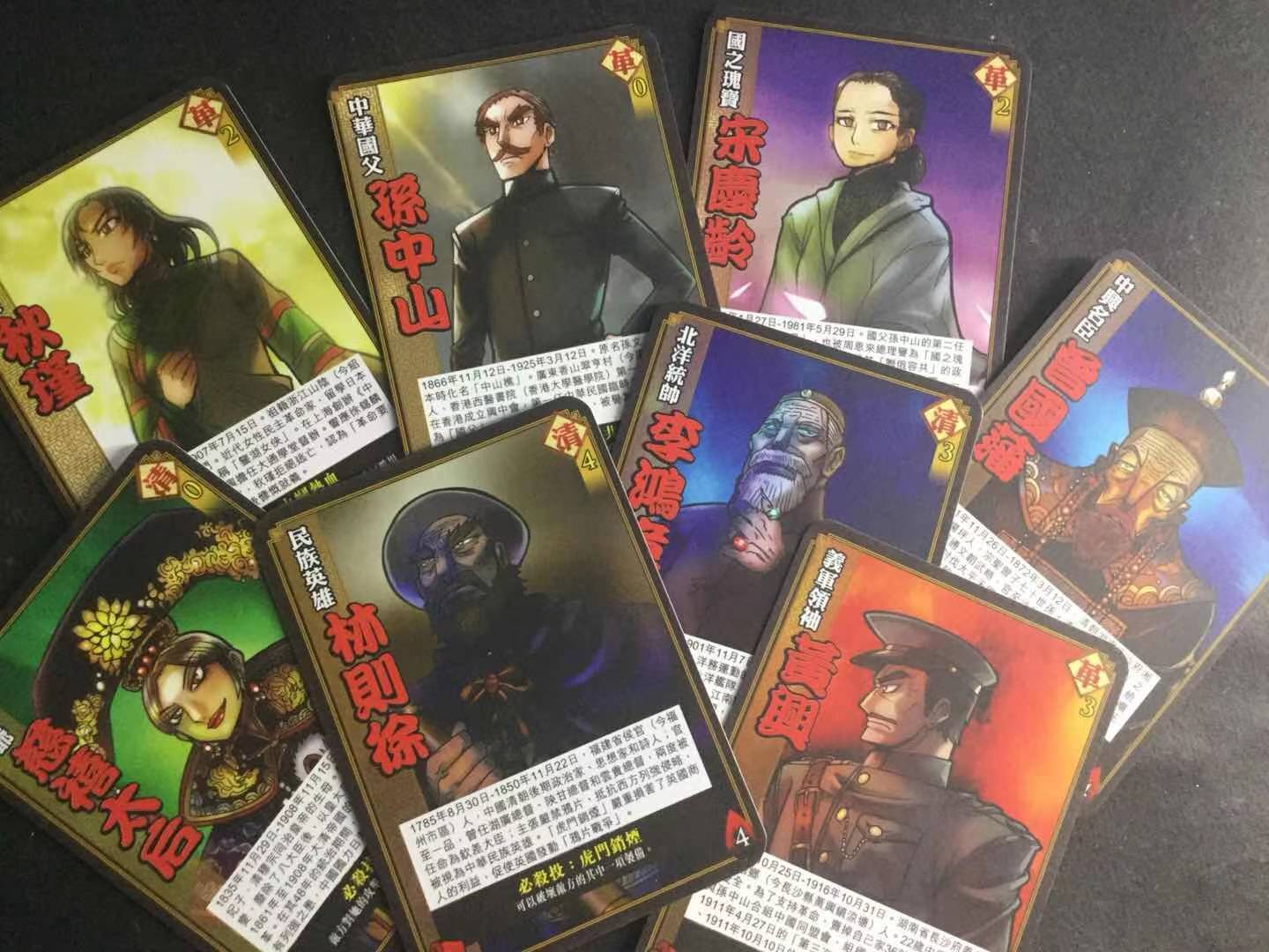 《还看今朝:中国近代英雄列传》是2011年香港一品娱乐有限公司设计的,从我后来能查到的极其有限的网上资料看,这个游戏应该是应中山市相关部门委托设计的一款游戏作品,内容以中国近代史的风云变幻为背景,很多我们熟悉的历史人物都有登场,绘画风格非常港漫。我手里的卡牌都是人物角色,可以看到每个角色有费用、所属阵营、攻击力、生命力等基本数值,也有非常简单的规则叙述(卡牌上白色部分大量文字其实都是这个人物的背景介绍),从设计和复杂程度看这个游戏应该很简单。不过由于我对这个游戏的所有了解也就限于此,所以并不知道是否有角色之外的卡牌类型,或者有没有“清”和“革”之外的阵营,如果哪位看官知道,请务必留言告之。