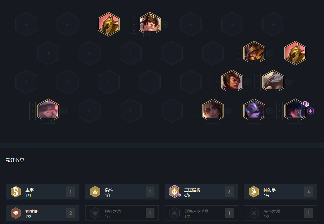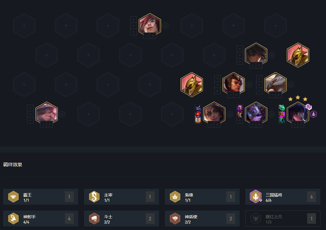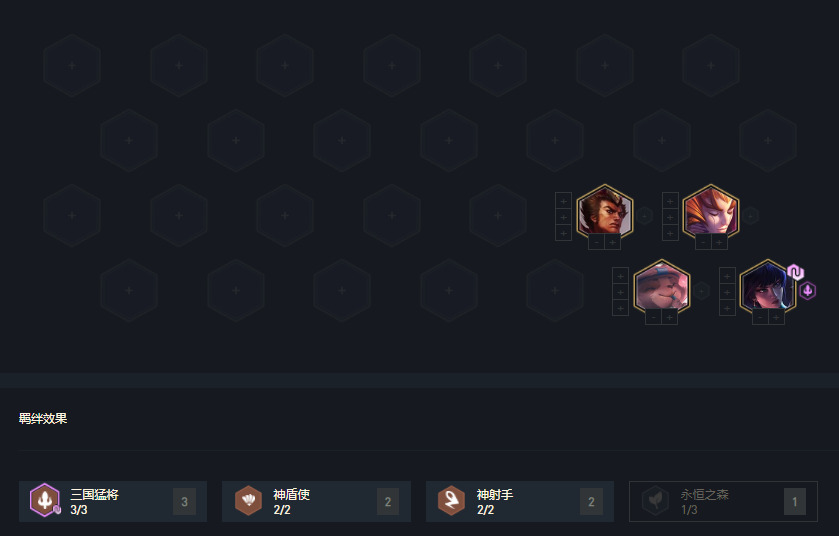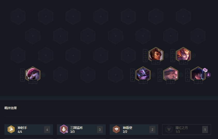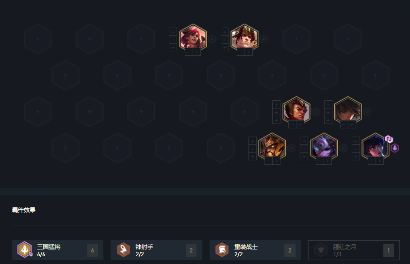 2阶段我们的目标就攒钱,留取三国棋子与神射棋子,我们的目标是6三国4神射,攻略后面有变阵,阵容并非唯一。