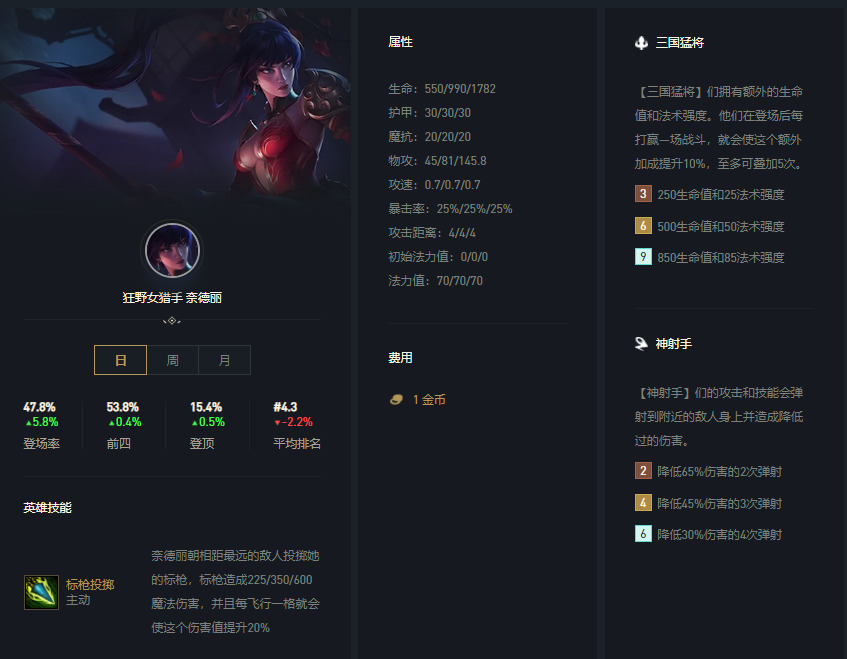 豹女是我们阵容的主C,在这个版本中豹女的强度超高,其最强的就是技能,3星豹女技能伤害只有600看似不高,但请注意其后面的技能描述,技能是朝最远目标投掷,标枪每飞行一个格子伤害值提升20%,咱们的棋盘是7*8的(横7竖8)这就比较变态了,咱们不用飞行8个格子只要5个格子豹女技能伤害就翻倍了在加上三国提供的法强与射手羁绊提供的弹射,一标秒一群,简直就是上版本的烬(烬是4此普攻,豹女携带青龙刀是5次普攻,携带青龙刀+飓风是4次普攻)。特别是这版本神射羁绊全等级+1溅射目标,伤害更猛烈。
