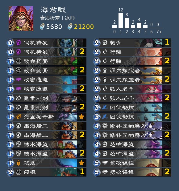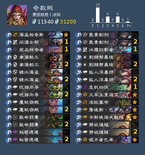 奇数贼同样吃到了氮素制剂的红利,有了小刀油之后,劈砍课程更加丝滑,卡斯迪诺夫教授地位更高,养刀流成为主流,构筑上氮素制剂取代了之前的影袭,更加偏向极限快攻,甚至比肩冷血削弱前的强度,奇数贼这只猛虎又重新长出了獠牙。只是过牌更快,伤害和上限更高的海君贼似乎更受玩家的青睐。别忘了氮素制剂和劈砍课程都是双职业牌,海盗战也能带这个万金油组合。只是海盗战没有盗贼那么稳定的检索武器的能力,收益远不如海君贼和奇数贼,容易卡手也缺乏韧性。总之海盗藏品和书虫的削弱还是太伤了,没资源的海盗战并不可怕,难回当年巅峰~