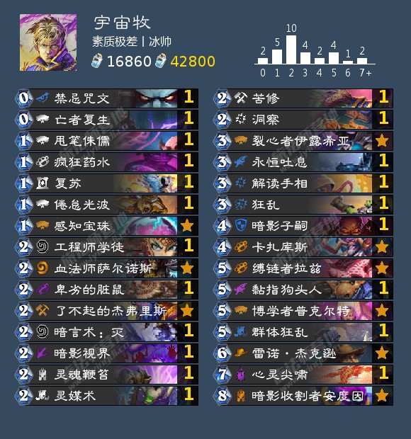 在农夫术削弱后,收获了狂乱的宇宙牧并没有成为新王,因为环境变得复杂和微妙了起来。在黑眼术数量减少之后,获益最大的宇宙术成了版本赢家。其实在得到了提克特斯之后,宇宙术的强度一直很高。因为它可以把构筑变得很薄,把更多的卡组留给快攻,打慢速全靠撕牌库。只是奈何没有应对前期超展开的能力,被黑眼术拿捏的死死的。如今宇宙术有了护甲商贩、冰川裂片和狂乱,应对黑眼术的手段多了起来,虽然仍处于劣势,但不再像从前完全不能打。巧的是上诉单卡魔块术也能带,还能带两张。与宇宙术一同被黑眼术打压,沉寂了几个版本的魔块术竟也重现江湖,以控制魔块术为主,并表现出了不俗的战力。