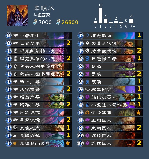上期说到黑眼倒了其实并不准确,严格来说应该是传统黑眼术倒了。不过黑眼术很快找到了新出路,去掉强化机器人、力代、灵魂之火等斩杀组件,外挂失心农夫、狂乱、亡语者一套,与传统的控制农夫术一起制霸天梯高分段,俨然有成为t0卡组的趋势。好在正义也许会迟到,但从来不会缺席,也为设计师的快速反应点赞,没有让狂野继续饱受荼毒,生灵涂炭。
