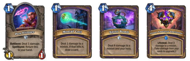 死亡缠绕:在对阵快攻时会很好用。除此之外,在慢速对局中,对手可能会不解你的场,此时可以用死缠打自己的怪(主要是狗头人图书管理员),以便打出亡者复生,这样就能更多的配合黑眼,并更快打出巨人。