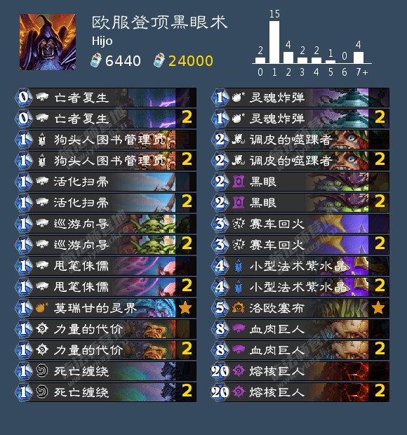 译者注:以上带牌观点来自于Hijo本人。外服和国服黑眼术的构筑区别较大,部分观点其实译者也不认同。Hijo的想法是尽可能少带一些Tech card就是针对牌,通过高速过牌来提高卡组流畅性和稳定性,不然容易出现黑眼不来、手上一堆斩杀牌的尴尬场面。译者认为赛车回火的费用较高,并不适合黑眼术;强化机器人只要给任何一个场上怪加了风怒,配合力代都是1费8点的高爆发。所以带牌观点仁者见仁智者见智,这里再给大家放几套国服高分段构筑,不愿意钻研黑眼术构筑的也可以直接抄别人现成的。
