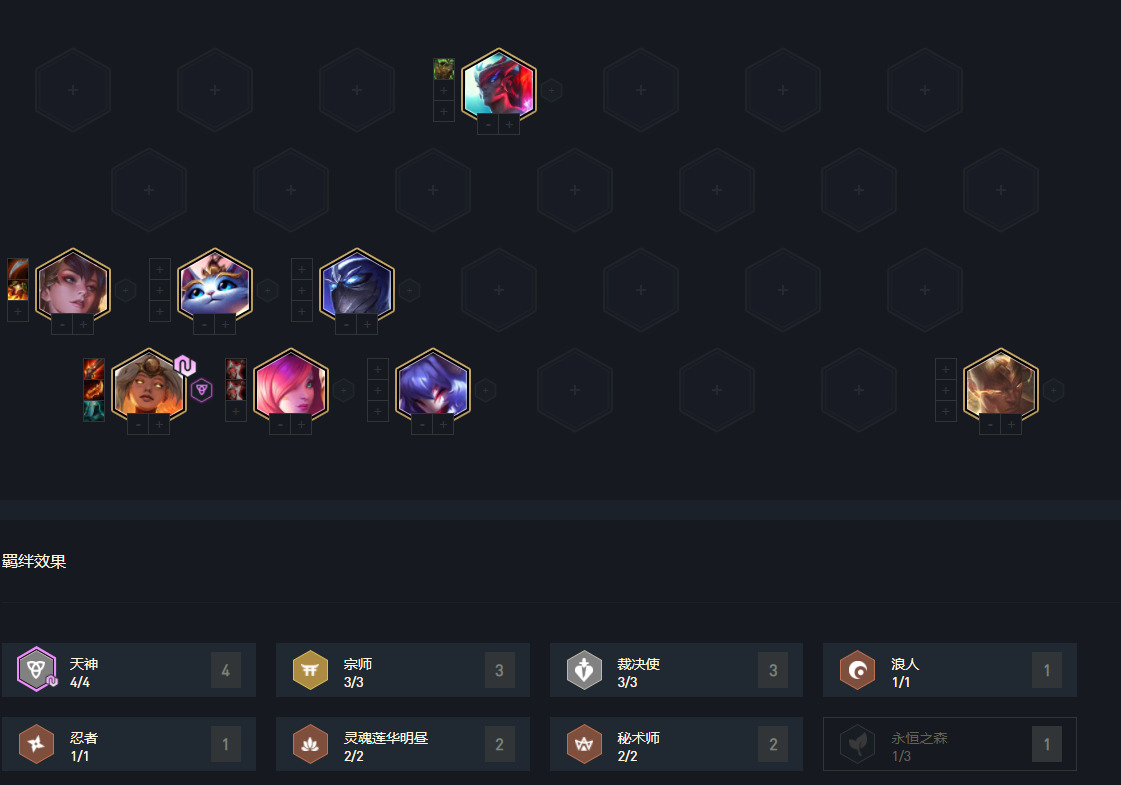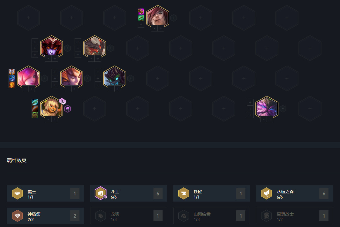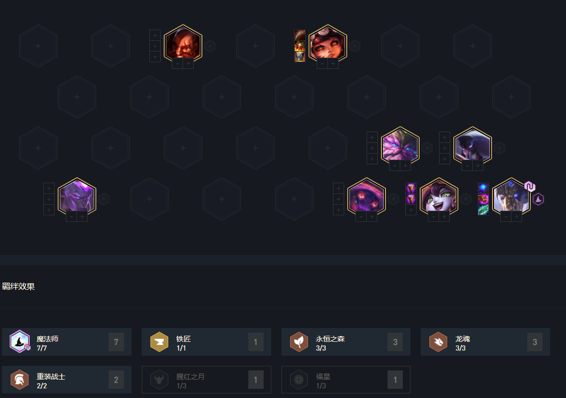 七法是大羁绊阵容,一共6个法师,成型比较困难,对装备要求较为苛刻,但阵容大成后强度很高,龙王一口喷秒杀一群。需要7法三龙魂后才能锁血,站位上尽量献祭除龙王外挂得龙魂棋子。