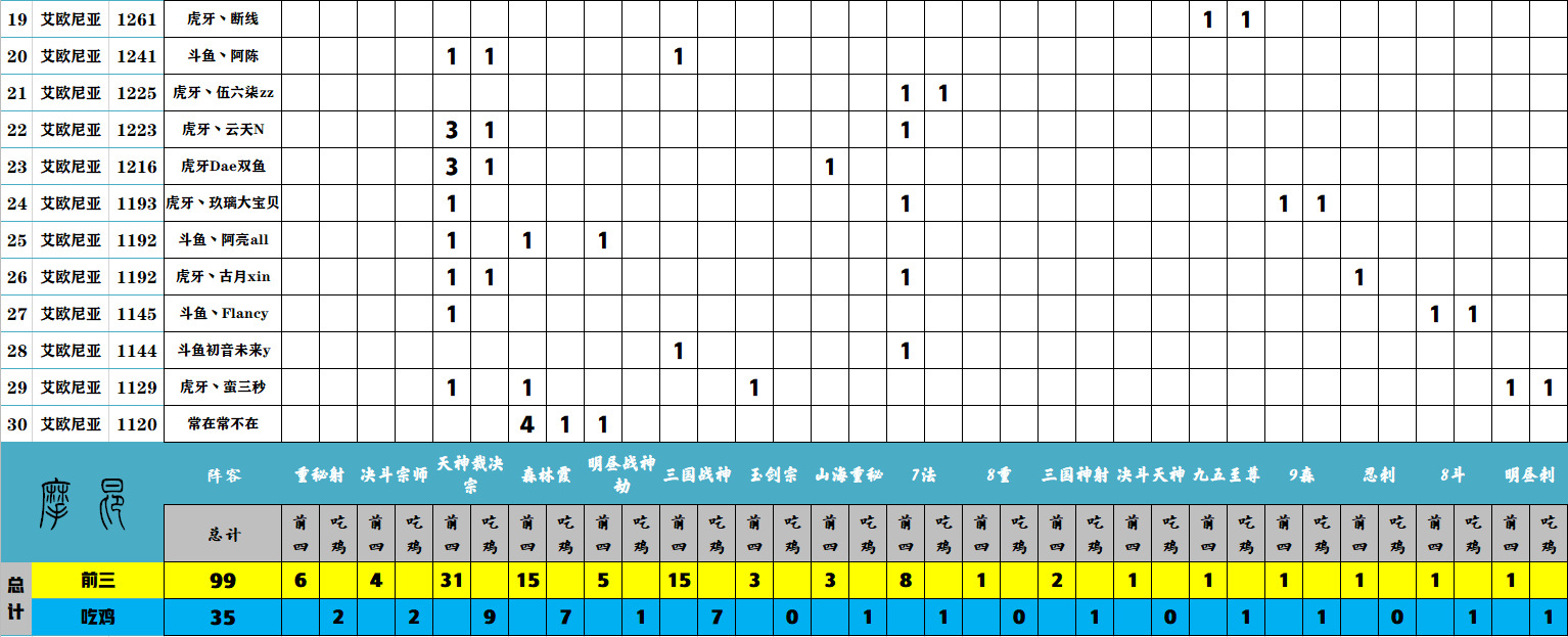 · 只统计艾欧尼亚服务器排名前30名玩家,无对局场次,或不够5场排位赛,名次顺延。