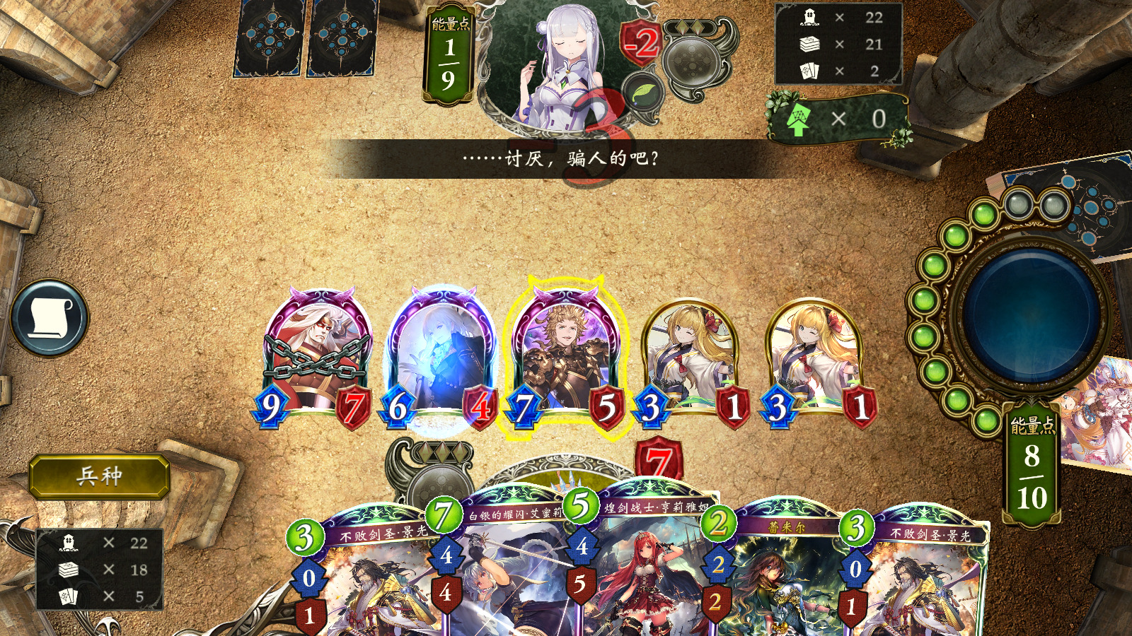 前期争夺场面。优先将不败剑圣·景光留到爆能使用,但对死灵等铺场职业时,如果后续回合有事可做,可以第1回合使用景光压场。第3~4回合有其他动作可做的话,优先将勇悍骑士·格尔德留到第5回合配合白银的耀闪·艾蜜莉亚一同使用,以获取额外解场频率。可以卖掉第1张沉睡的辉龙·亚瑟,但对组合技时,尽量保留第2张亚瑟到中后期用于减伤。
