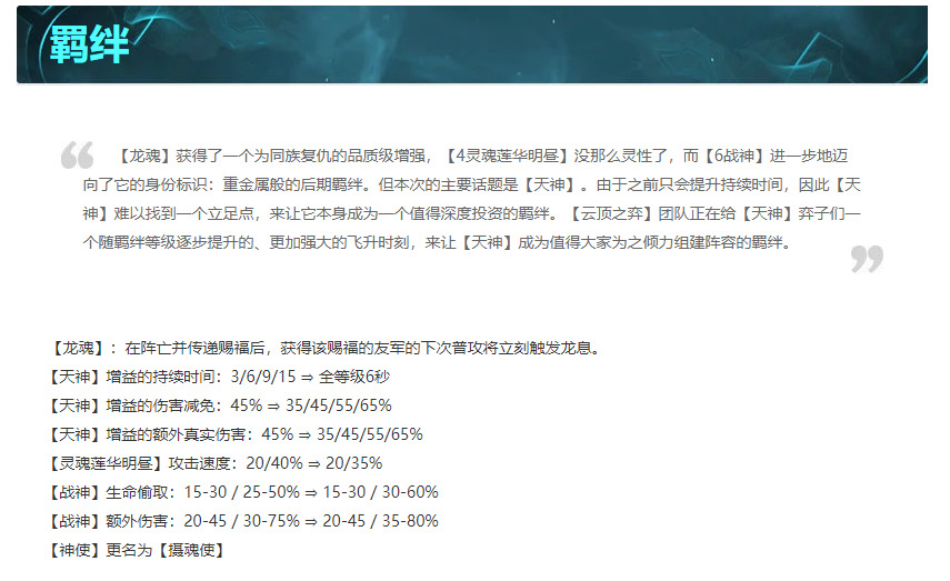 解读:战神羁绊增强,3战神羁绊无改动,6战神羁绊增强,生命窃取最低值回调到30%,与版本初期一致;生命窃取最高值增加到60%,吸血能力更强。6战神额外伤害提升,最低增加到35%,也就是说敌方满血战神棋子也能增加35%的额外伤害,而敌方血量越低伤害越高,额外伤害最高值增强到了80%伤害,战神们的斩杀能力变得更强。
