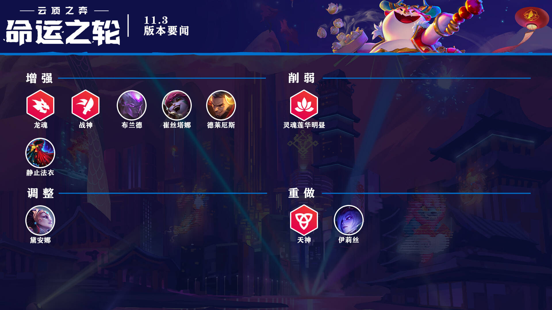 今天(2月3号)晚上6:35英雄联盟官网发布云顶之弈11.3更新公告。此次更新内容略少,但对当前版本影响还是很大的,下面我们来一起看下。祝福大家小年快乐!