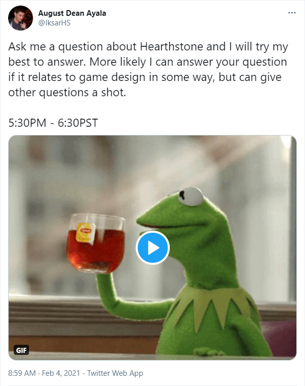 Iksar:(比起九职业胜率平衡)我更倾向于一个随时间不断变化的环境,当然实际上很难做得到。理想情况下,先有一个明显最强大的卡组,然后被针对,然后新的最强卡组崛起。