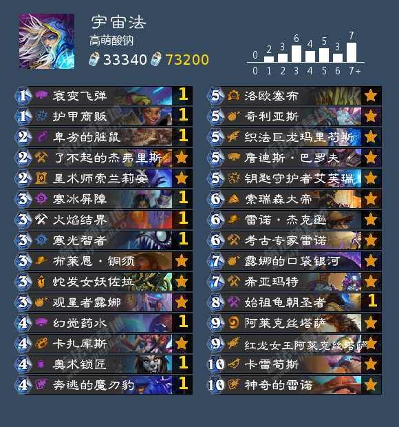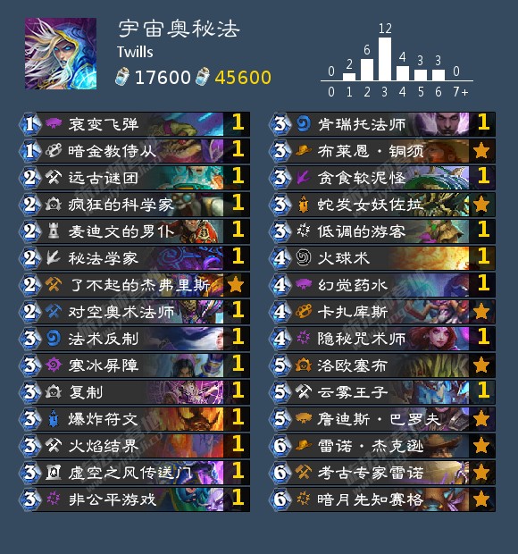 来自Twills的一套宇宙奥秘法,他以20-12的战绩打到了传说前200。 现在环境控制卡组增多,有了狂乱、护甲商贩后快攻抗性大大增强,再加上法反现在简直随便破,传统奥秘法优势尽失。作者尝试探索后发现宇宙奥秘法表现良好。起手留牌:姐夫,低费曲线,看情况留奥秘。打术牧留非公平,可以留隐秘咒术师。