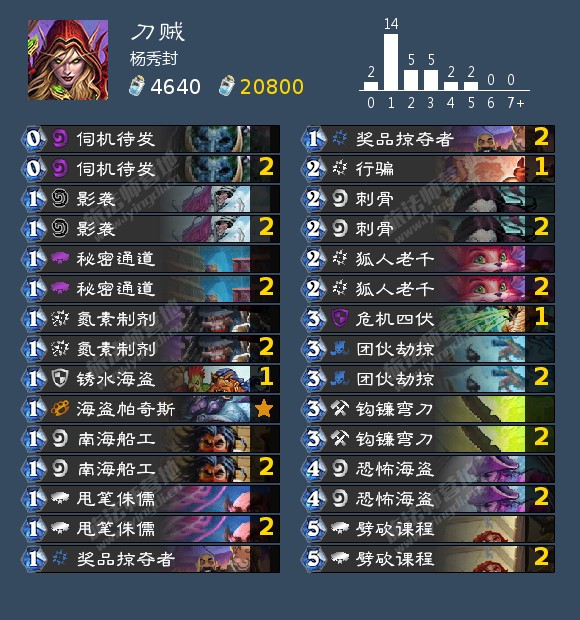 来自 杨秀封的一套刀贼,他以35场69%的胜率打进了国服前百。与标准的刀贼不同,这套的构筑框架更像狂野的海君贼,只不过把弑君换成了钩镰弯刀。卡组优势:1不怕宇宙牧的裂心者换手牌,我们玩海君贼如果手牌中有刀,被换掉后会很恶心,这套牌可以恶心牧师。2打所有套牌都拥有信息差,我们和海君贼很像,但是启动速度比海军贼快(因为我们一上来就是4攻刀),对黑眼术的威胁程度比海君大。玩海君的时候,或许会犹豫这个药膏要不要给普通小刀,这套不用,因为我们的刀大多数时候最高就4攻。3这套牌的上限很低,因为伤害是固定的,但是下限高,因为费用曲线很低,所以不太可能卡手,考虑到最大的敌人就是回血,所以特意带了危机四伏来针对雷诺。卡组缺点:除了对黑眼术是优势,其他对局均为劣势对局,推荐娱乐玩家尝试,上分玩家慎用。