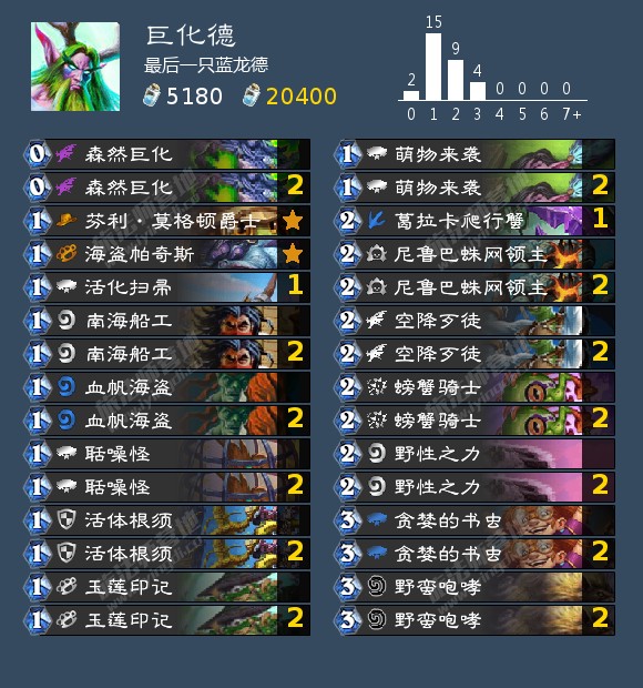 来自 最后一只蓝龙德 的一套巨化德,他以60场63%的胜率打上了传说。在书虫被削弱之后,巨化德一直在狂野沉寂。新卡螃蟹骑士为这个古老的卡组注入了新的血液。有了螃蟹骑士的补强卡组不管是解场还是进攻都有了很大的提升。卡组带了螃蟹,针对现在比较火热的海君贼以及海盗战等卡组,带了一张活化扫帚是为了更好的返场。