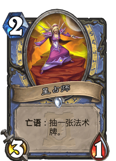 虽说这张卡1血在对抗快攻的时候有点鸡肋,但定向检索法术在偏随从的奇迹法中还是很值得携带。这张卡有一些需要注意的点:前期,它与资深探险者,奋进的探险者同时在手上的话,且对面不是快攻职业,优先级是:奋进的探险者> 星占师 > 资深探险家;中期下星占师之前先看一下牌库有什么法术,再决定是否下,因为两费还是延迟效果,需要考虑节奏是否会受到影响;星占师如果你要主动送掉的话,看看手里有没有抽牌(怨灵之书除外)(如223奋进的探险者),先抽牌,再送掉占星师,这样你抽牌抽到法术的概率更大,法术上手,怨灵之书也更好发挥;要开怨灵之书时,先送星占师;手上有法力飓风准备下回合刷牌时,这回合得提前下星占师抽法术。