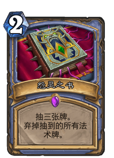 作为套牌的唯一过牌,也是因为这张牌才尽量减少了这套牌的法术数量。一般情况下,怨灵之书作为一张2费过2.5张的过牌,是非常理想的,费用也低(但是作为非洲人的我,还是经常一开丢俩法术,唤醒是常客2333)。提一下奥术智慧,作为3费牌,在现在的狂野环境真的不够看,你3费空过抽两张,约等于宣告死亡。它在法术偏多的偏于博上限的奇迹法卡组也中最多只有一张,奇迹法玩家们转而携带更能讲故事的研发计划(但我还是经常看到别人带怨灵之书,还带远古雕文、魔术戏法等很多法术,我们不是宇宙任务法,前期需要书的过牌来加快节奏)。提一嘴,怨灵之书并不是出牌最优先的选项,能先出别的就先出别的,但是裸开也不要舍不得,节奏卡住才是最难受的。