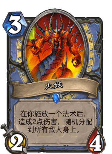 在本卡组中,我一般并不指望哀绿+火妖,然后一顿喷把对面喷残血,毕竟法术还是少。更多情况是开门后补伤害,对抗快攻进行清场。我一般对抗快攻职业才留,而且火妖在面对一地巨人时没什么作用。曾经我还带过火印火妖来对抗快攻,后来发现效果不理想。