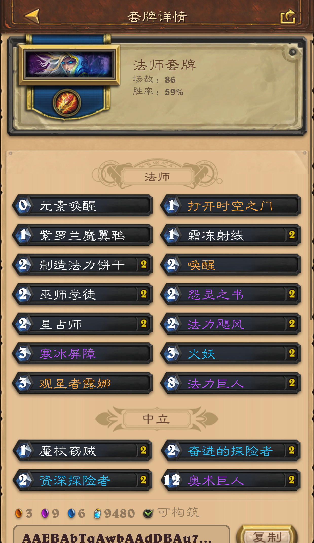 大家好,我是AmouR,五年营地潜水人员。最近狂野天梯环境回暖,中速卡组数量增多。奇迹法作为一个拥有对慢速强大压制力的卡组,对于宇宙牧、宇宙术、大哥牧等慢速卡组我们拥有着很不错的胜率。但在面对黑眼和弑君奥秘法等超快卡组时,我们没有任何反制手段,赢的概率很小,谈真正的上分不现实,只是一套很好的针对环境的卡组;不建议大家冲分使用。毕竟玩奇迹法就为了随机的快乐。