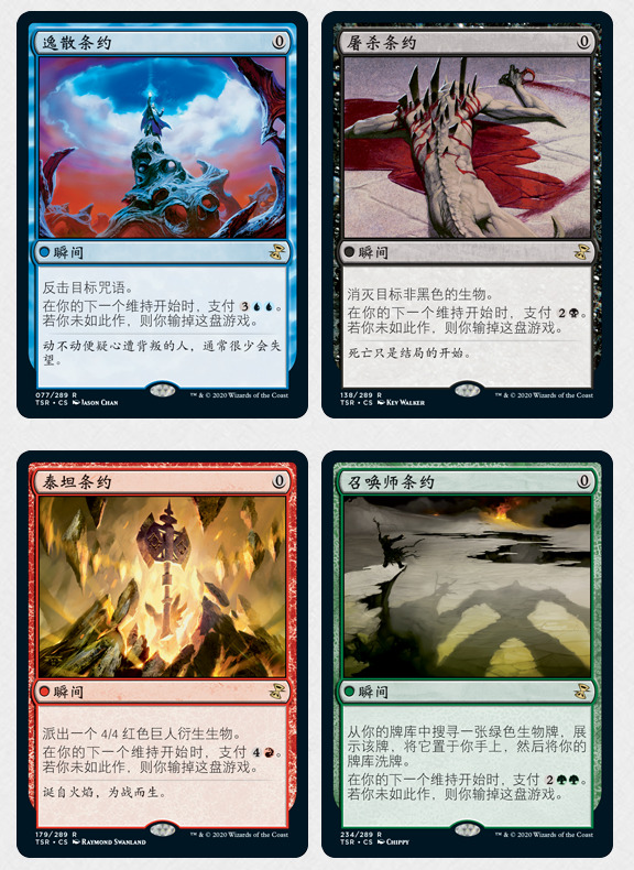 对不知情的玩家来说,机飞系列(机飞版、机飞版第二代,以及Unstable和Unsanctioned)是我的宝贝。这些年来我常常会被叫去替它们辩护,而我常常会用的一个论点就是它们是个测试未来的好地方。举例来说,全图地、衍生物卡、连体牌,和融合机制都是先出现在机飞系列中的。条约循环也是另一个例子(没错,这在预知将来里是个完整的循环,但白色的干预条约被评为不值得在时间漩涡重制版中重印)。