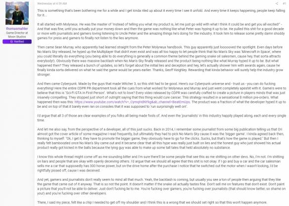 VGC表示,Thomas Mahler在帖文中将枪口对准了《上帝也疯狂》和《神鬼寓言》的缔造者Peter Molyneux、《无人深空》以及Hello Games工作室的创始人Sean Murray以及打造《赛博朋克2077》的工作室CD Projekt Red。