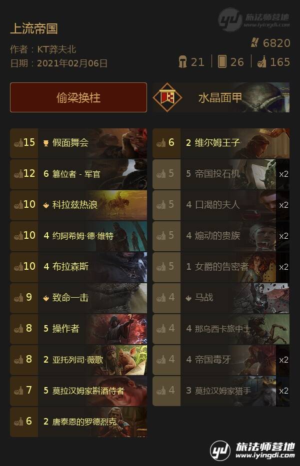 60%的对手我们可以剧情劝退,20%的对手试探一下继续小逼,但是被夫人牛屎劝退,20%的对手干旱剧情头铁全交,那 就来一场公平的对决吧(尽管没有拉蒙锁和滤牌,但我们多了和剧情、毒、同化相性极高的夫人、帝国投石机,所以正常剧情帝国如何抗压我们就怎么来,短局手段依然是历变约阿)